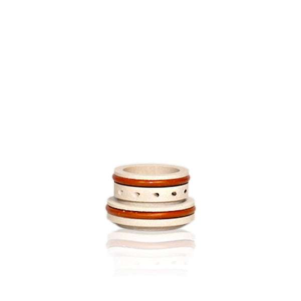 Завихрящият пръстен регулира потока на плазмения газ около електрода, осигурявайки прецизно центриране на дъгата през дюзата. Това оптимизира процеса при високи скорости на рязане и при обработка на материали с по-голяма дебелина.